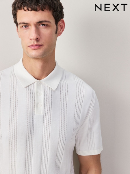 White Regular Fit Cotton Rich Pointelle Stripe Knit Polo Shirt