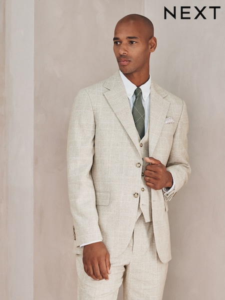 Neutral Regular Fit Check Cotton Linen Blend Suit Jacket