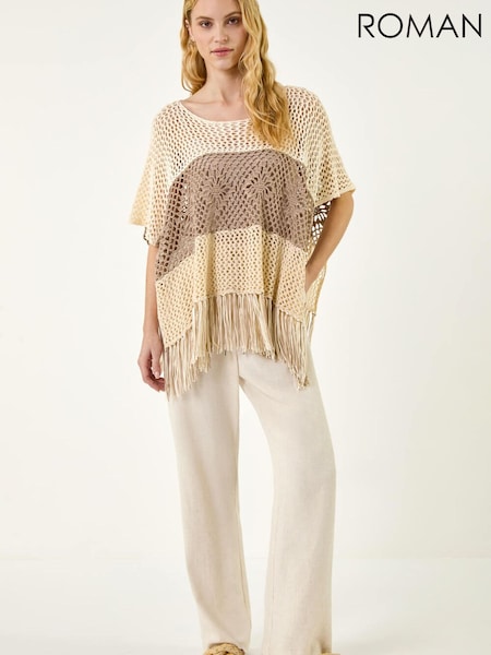 Roman Natural Tassel Stripe Crochet Poncho
